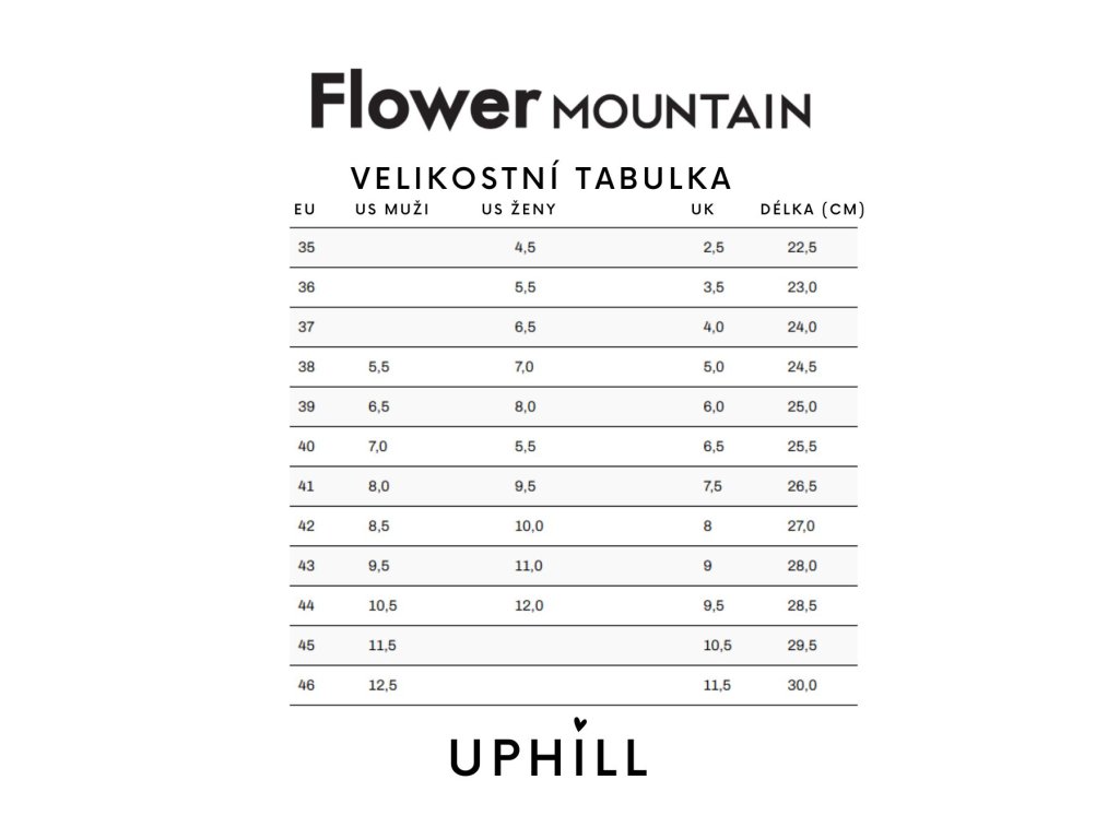 Boty Flower Mountain mají ve srovnání s jinými značkami sportovních bot (Typ: Nike) velký střih, proto doporučujeme vzít si velikost pod obvyklou velikost. Složení: 55% Kůže 45% Bavlna