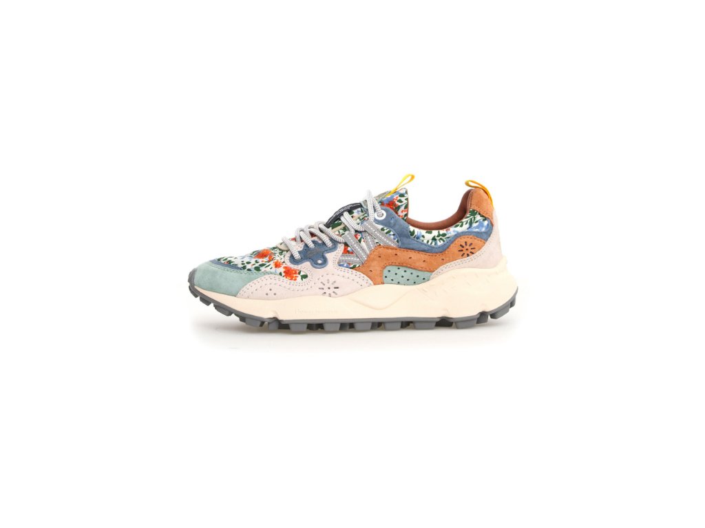 Tenisky z potištěné technické tkaniny a vícebarevného semiše. Trekingové tkaničky a přizpůsobené tvarované očko. Kožená podšívka a antibakteriální přírodní korková podrážka. Ultralehká gumová podrážka s dobrým outdoorovým vzorkem.